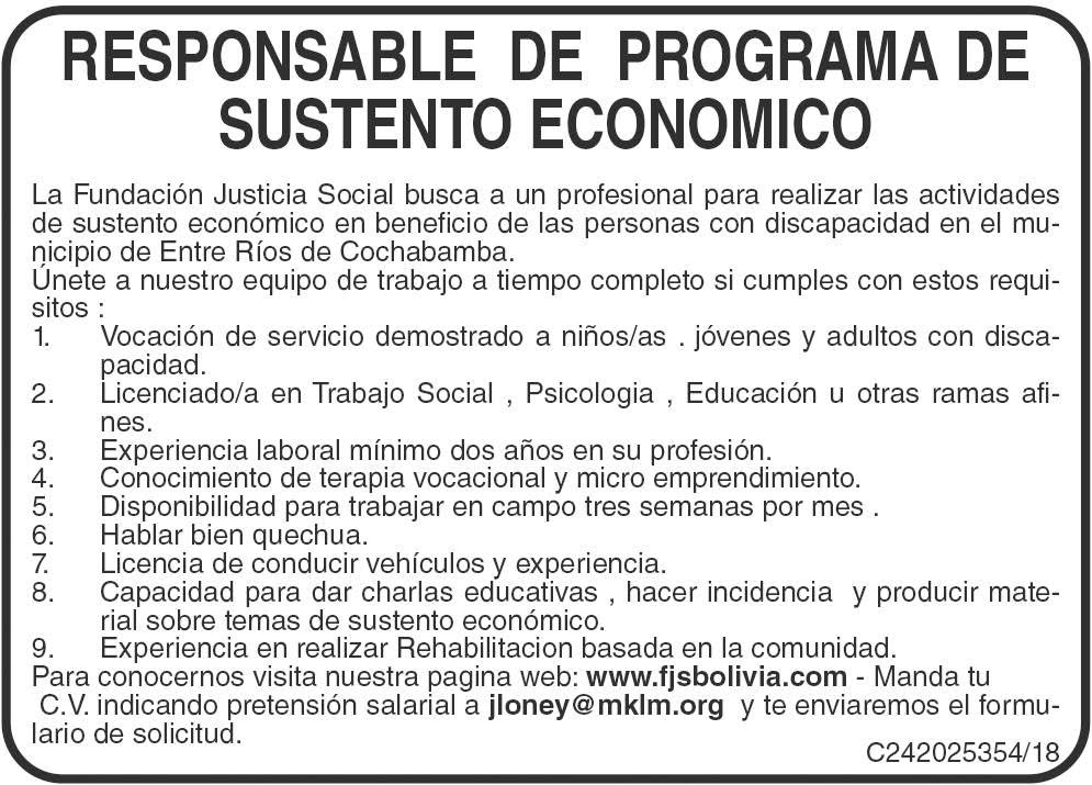 La Fundación Justicia Social busca a un profesional para realizar las actividades de sustento económico en beneficio de las personas con discapacidad en el municipio de Entre Ríos – Cochabamba.